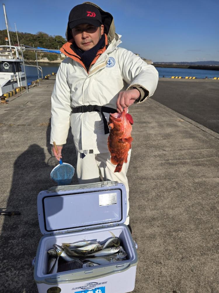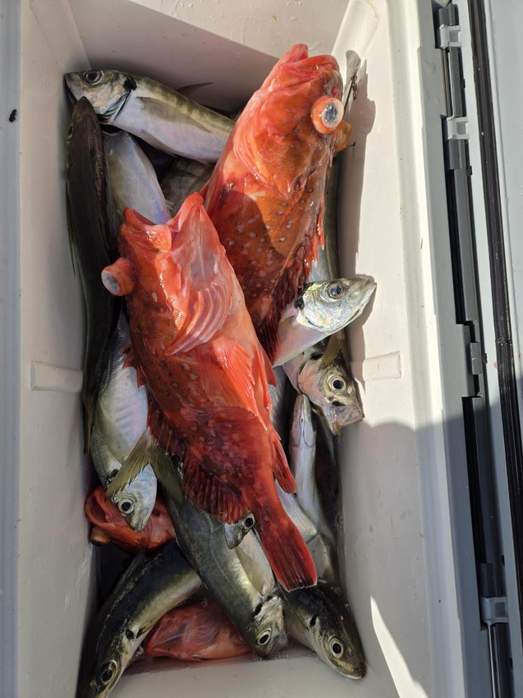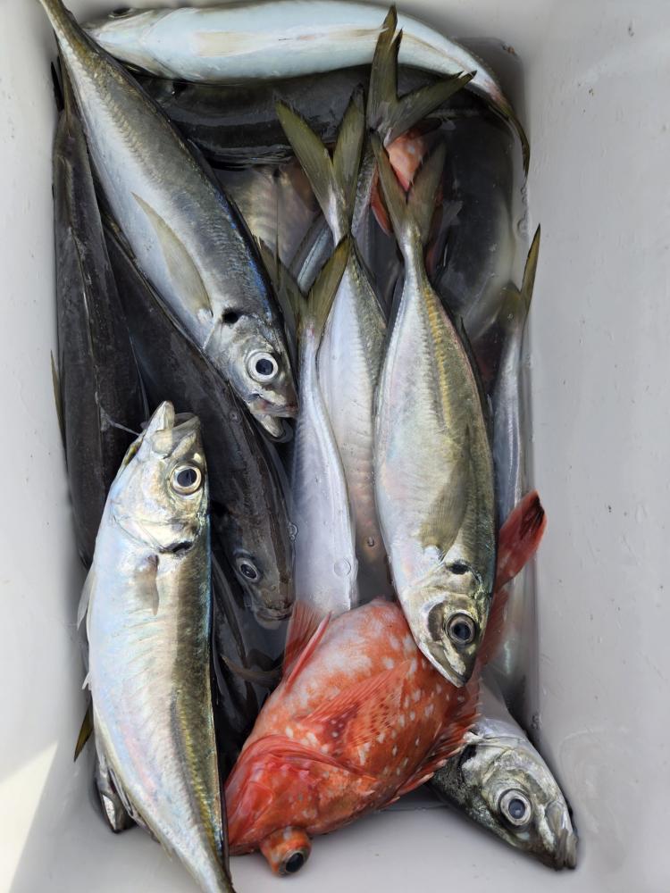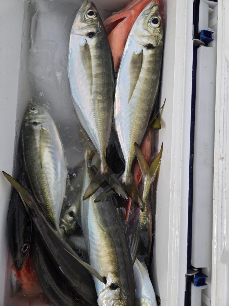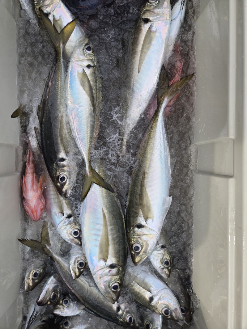 本日も久里浜沖に出漁しました。水色澄み前半は顔見るも中型に小アジ混じりで活性は良くありませんでした。後半多少水色に色が付いて良型揃いでポツポツ当たりました。アジ20~40cm 19~43匹。外道に最大42cmのカンコカサゴも混じり皆様お土産確保できました。