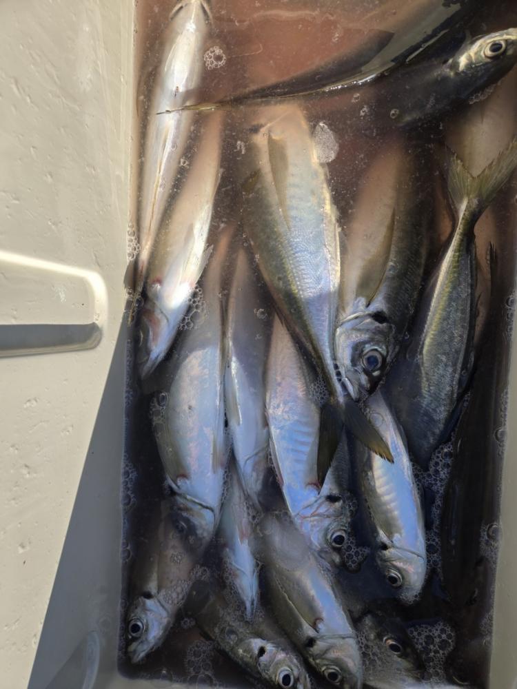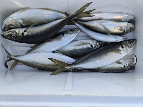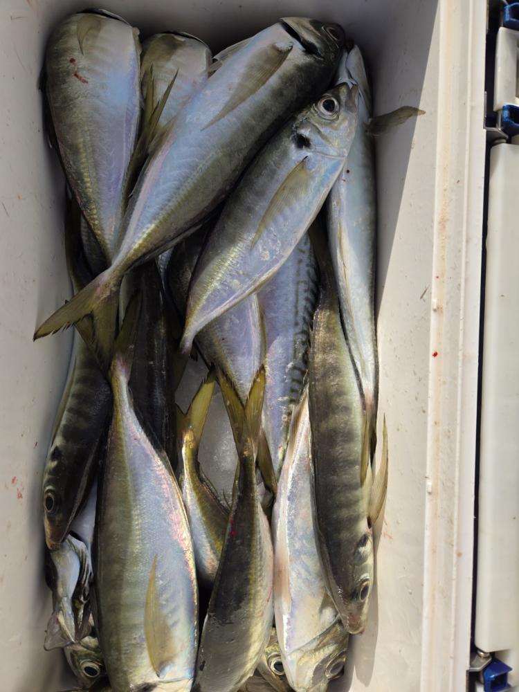 久里浜沖に出漁しました。第一投目で顔出しポツポツ当たり始め帰りまで場所移動も無く食い続きました。良型揃いで皆様クーラー重くなりました。アジ26~38cm 30~48匹。外道にサバ、カサゴ。