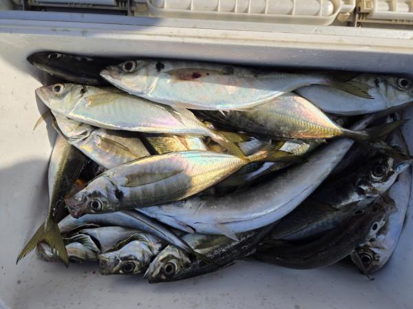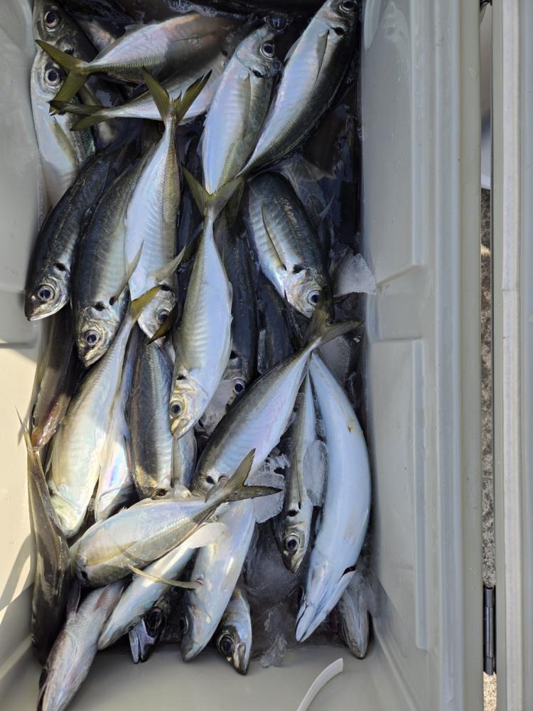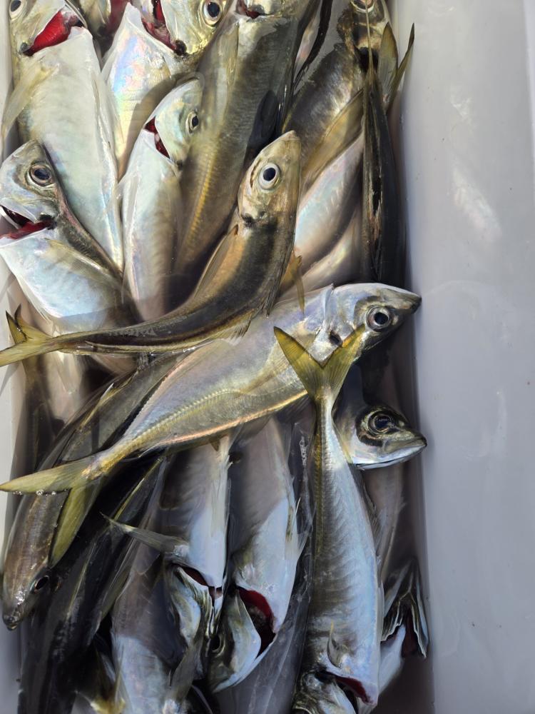 久里浜沖に出漁しました。一投目から顔出し、午前中は良型揃いでサバも混じり1日ポツポツ当たりました。皆様クーラー重くなりました。アジ23~36cm 48~67匹。次手66匹でした。