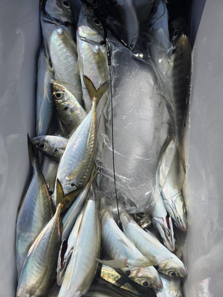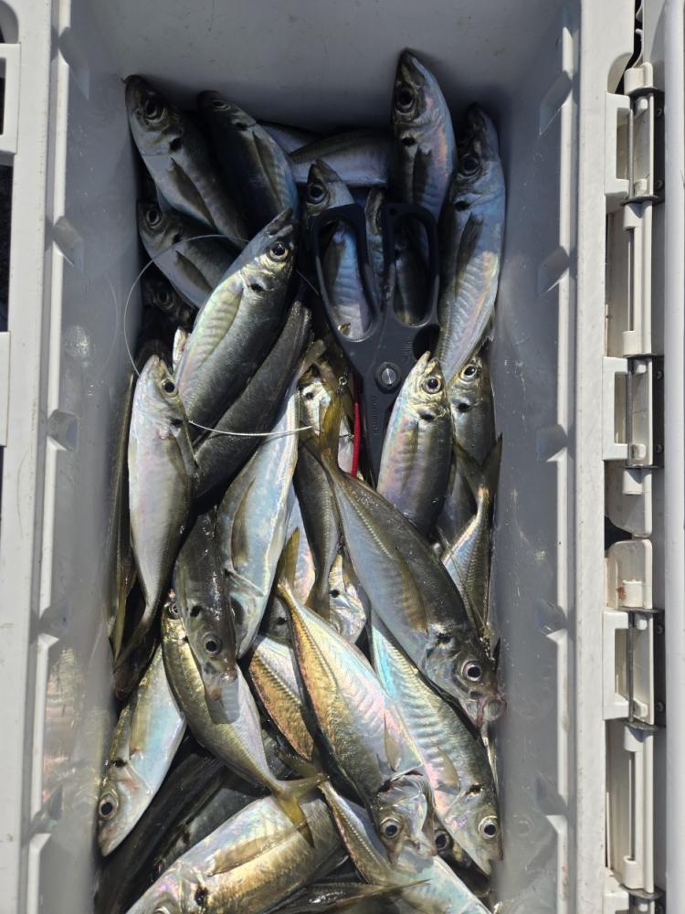 本日も久里浜沖を狙いました。一投目から顔出し始め、良型主体で1日ポツポツ当たりました。本日はサバも少なく数も伸びました。皆様クーラー重くなりました。アジ24~36cm 48~99匹。