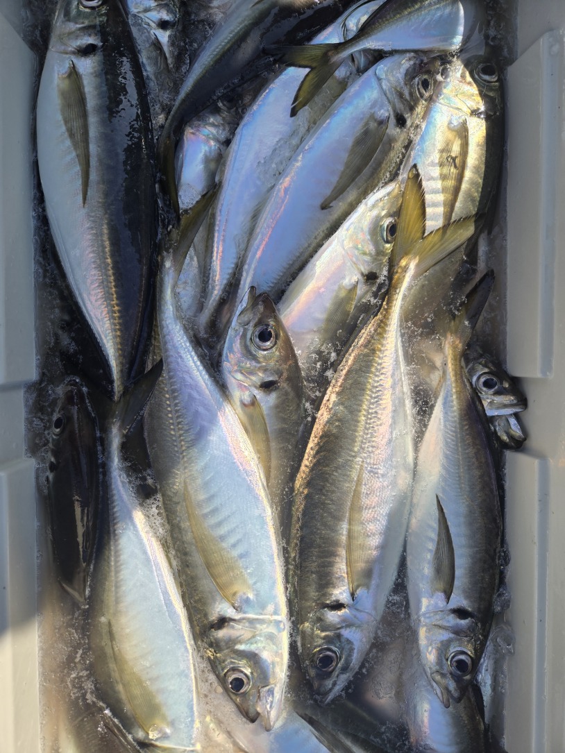 本日も久里浜沖に出漁しました。北風強くつりづらく朝イチは外しましたが、移動後サバ混じりで良型主体で1日ポツポツ当たりました。アジ25~36cm 10~76匹。