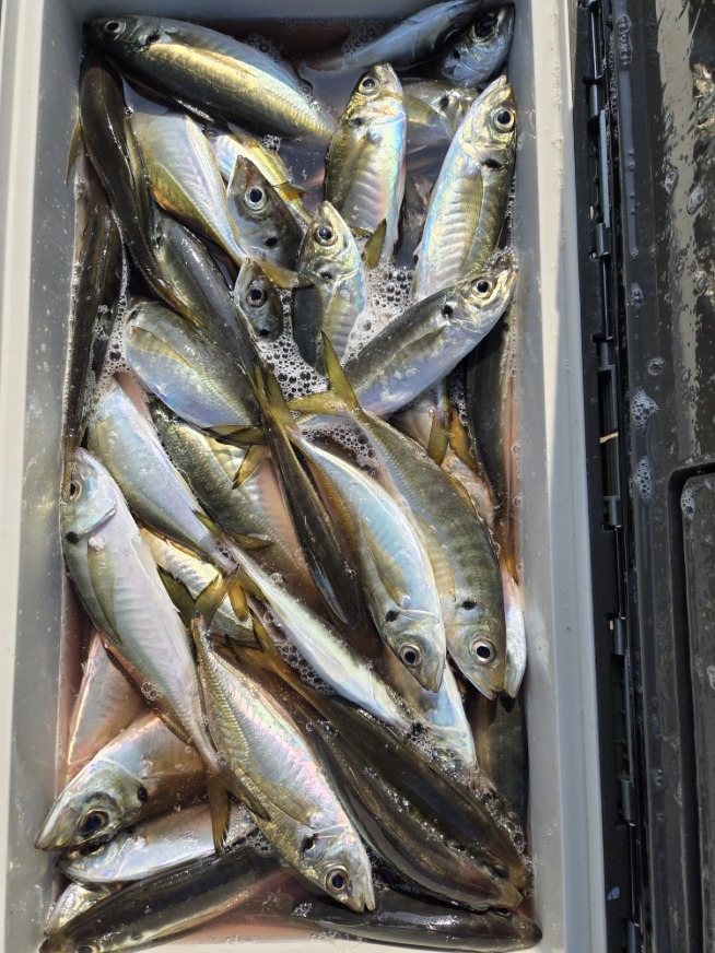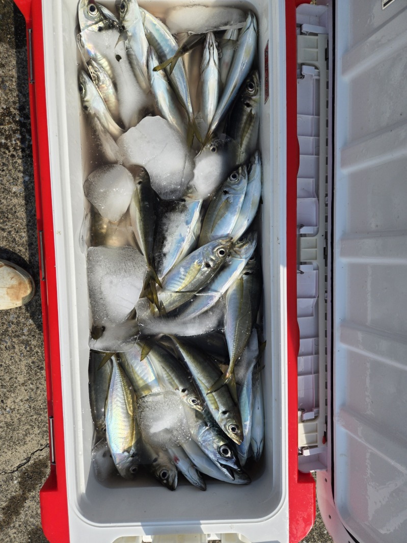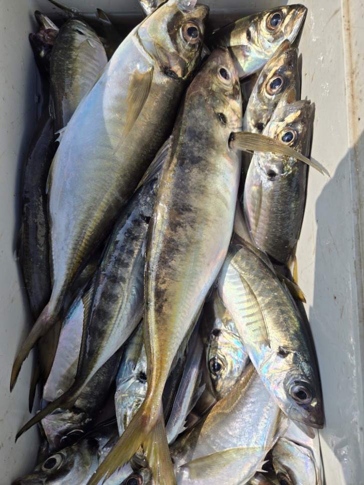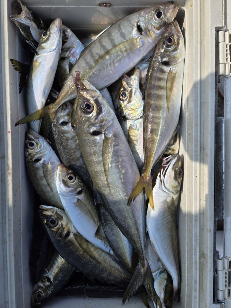 観音崎沖に出漁しました。本日は1日アジの活性は良く釣れ続きましたが、中型主体で大型は混じった程度でした。アジ23~36cm