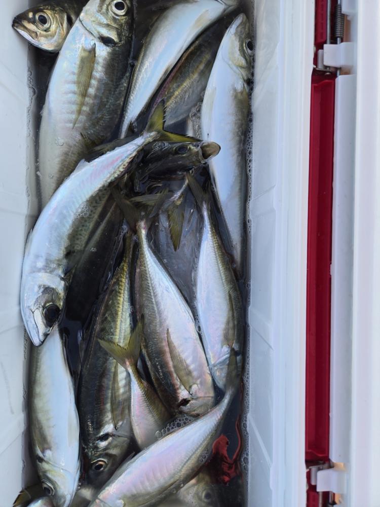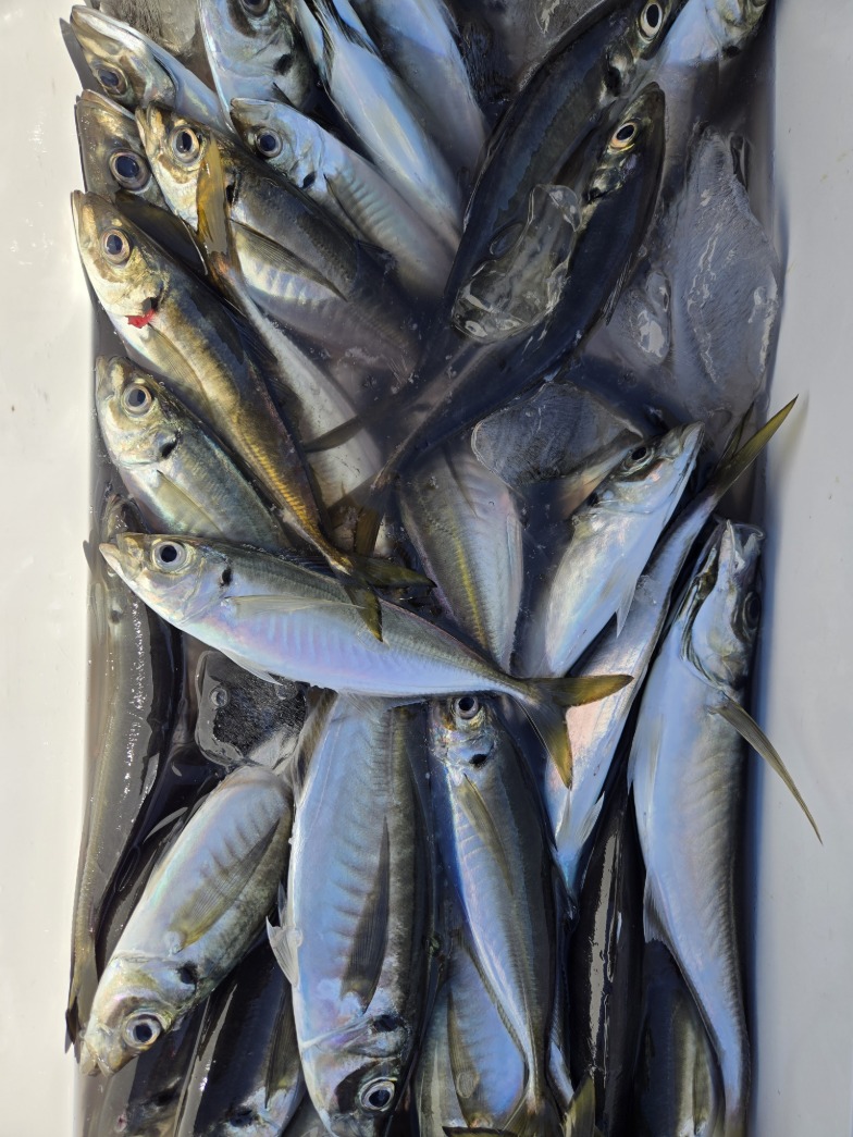 本日も観音崎沖に出漁しました。1日良型混じりでポツポツ当たり皆様クーラー重くなりました。アジ24~36cm 39~100匹。