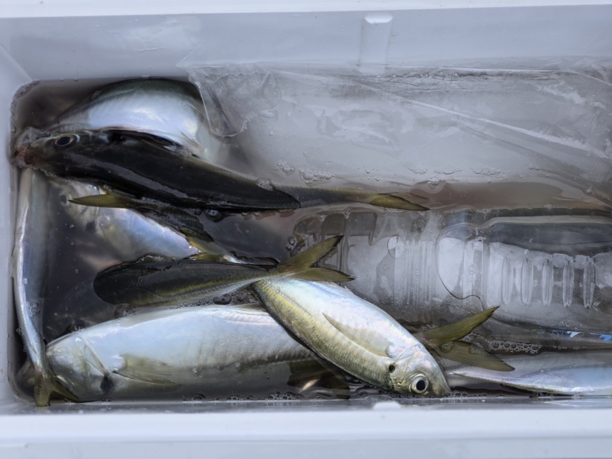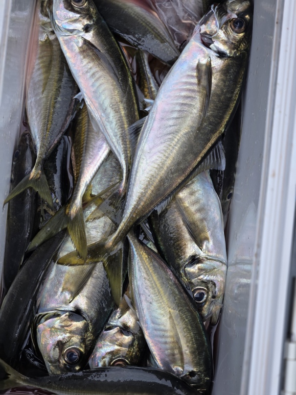 観音崎沖に出漁しました。本日も中型主体で1日ポツポツ当たりお土産確保できました。アジ23~36cm 57~94匹。