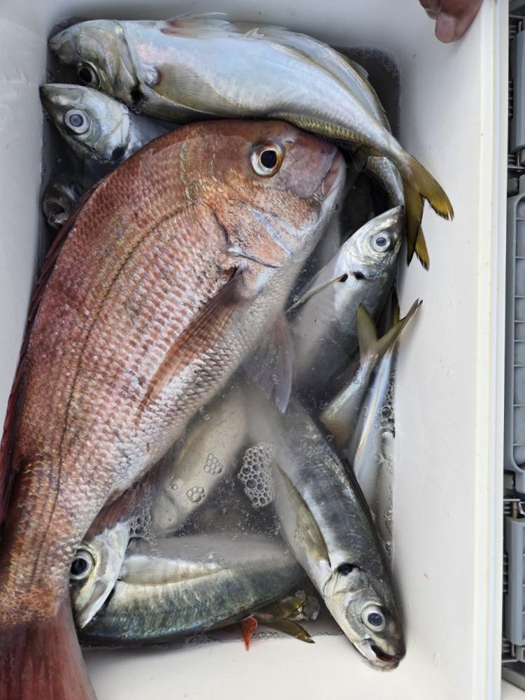 本日も何時もの観音崎沖を狙い、朝ポツリポツリ当たるものの潮が速く成り場所移動し、後半も良型ポツポツ当たり、皆様お土産確保出来ました。23~38cm 28~48匹、次手46匹。外道にマダイ。