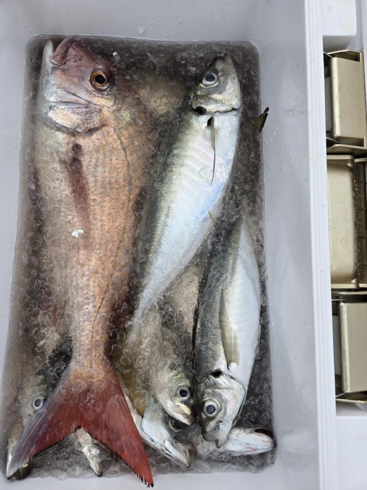 観音崎沖から狙いました。顔出すものの続かず苦戦しました。23~35cm 7~23匹。外道にマダイ。